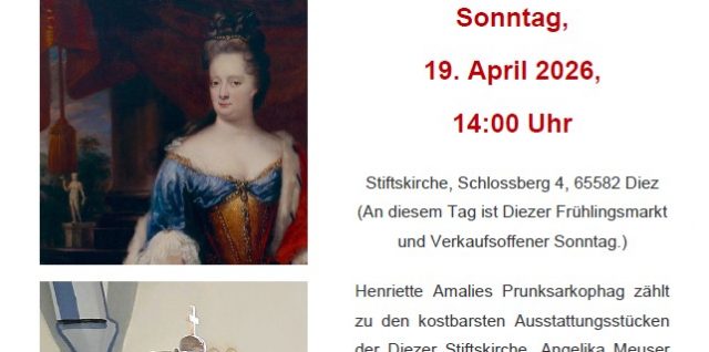 Henriette Amalies Prunksarkophag zählt zu den kostbarsten Ausstattungsstücken der Diezer Stiftskirche. Angelika Meuser und Georg C. Pick führen ein in die Bedeutung des Lahnmarmors und die fürstliche Bestattungskultur im barocken Diez. Eine Veranstaltung in Kooperation mit dem Lahn-Marmor-Museum Villmar. Eintritt 300. Todestag Henriette Amalie von Nassau-Diez weiterlesen