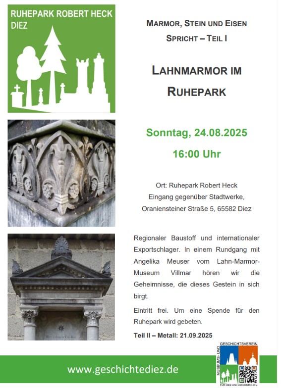 Verschiedene Materialen haben ihre ganz eigenen Eigenschaften und bergen Geschichten ihrer Entstehungszeit in sich. Wir hören hin, was Lahnmarmor und Metall im Ruhepark zu berichten haben in zwei Führungen: